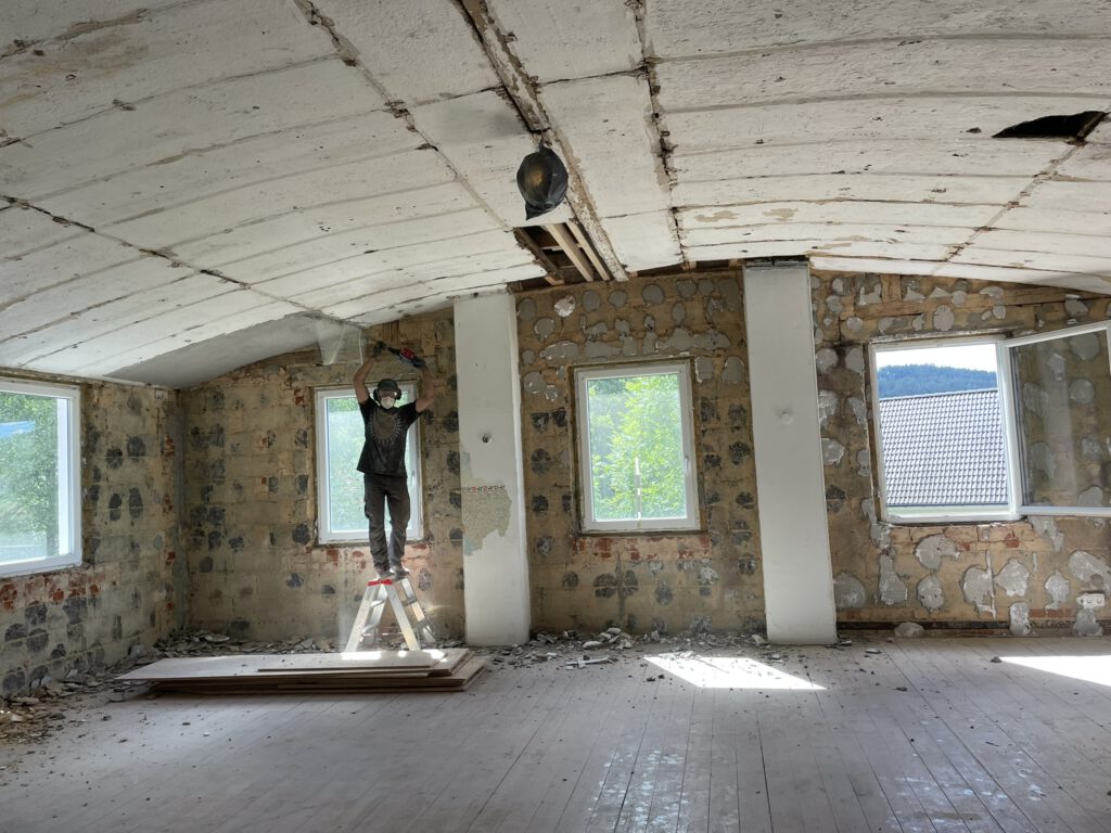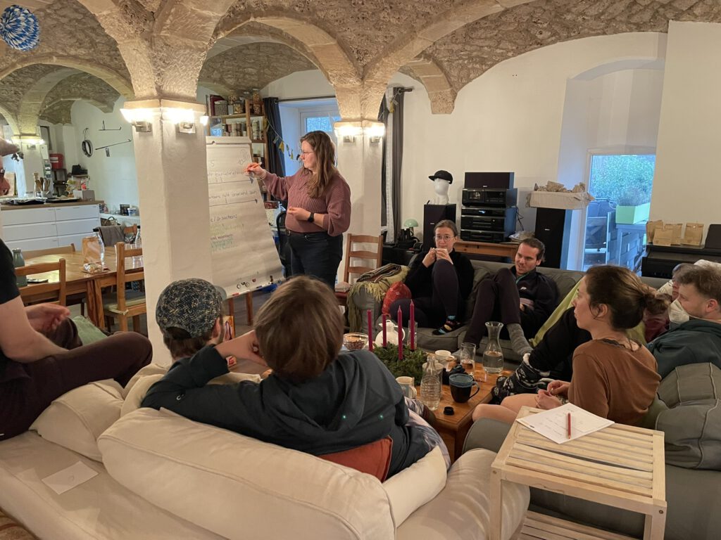 Wir sind aktuell neun Personen, die dieses Projekt bestreiten und beabsichtigen nach den Umbauarbeiten in das Haus zu ziehen. Jede/r von uns ist Teil einer Arbeitsgruppe. Da wir uns aktuell noch in der Umbauphase befinden, treffen wir uns einmal wöchentlich zum Planen, Austauschen, Aufgaben verteilen.